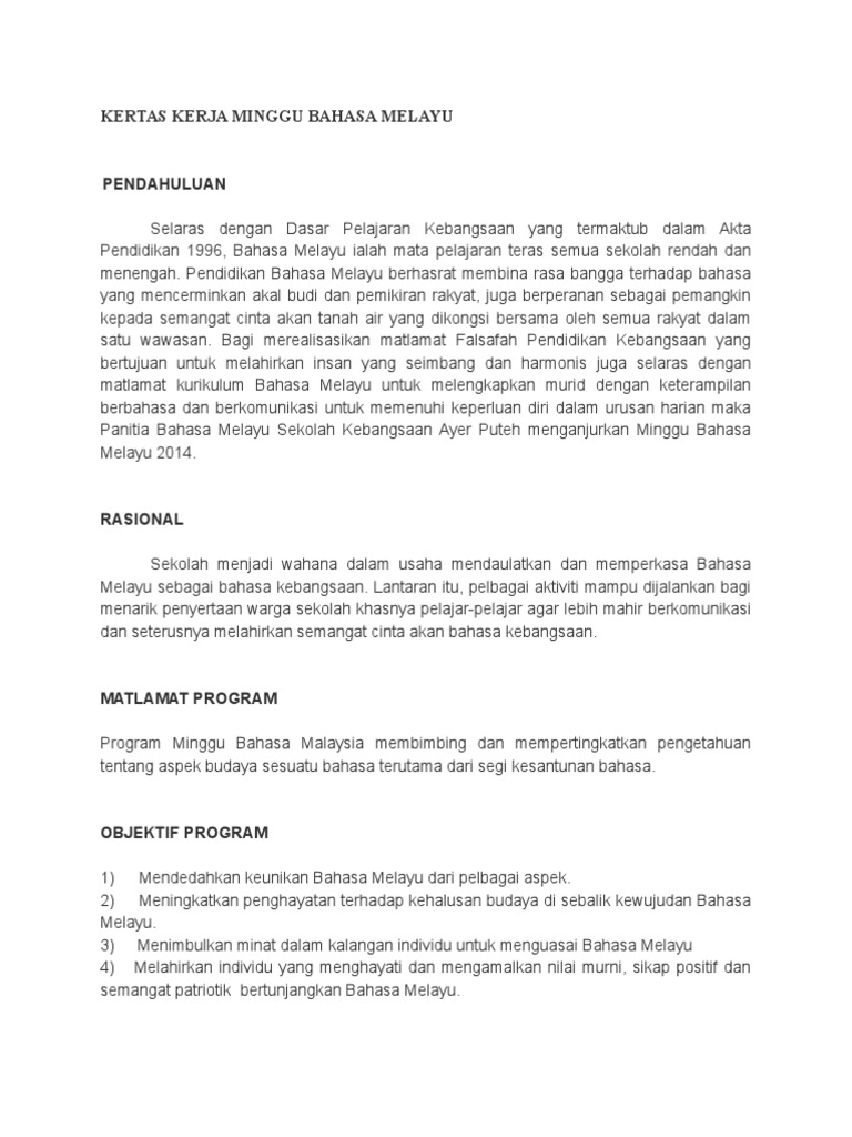 Doc Kertas Kerja Untuk Program Minggu Bahasa Melayu Za Lia Academia Edu